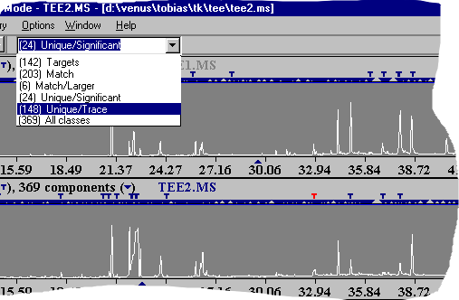 Every chromatographer knows this nice practice to overlay chromatograms and to compare them via the graphical peak pattern. This may be helpful in some cases but is only a very simple method. Within AMDIS you can compare them via mass spectra and retention values. This topic allows to find substances which are existing or absent in a certain chromatogram. You have to open both runs in one active window.