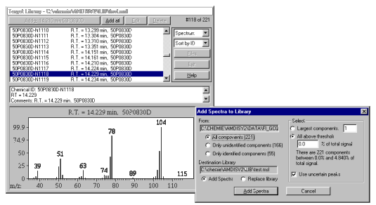 Library handling in AMDIS Many programs for GC-MS or LC-MS data processing can produce user (mass spectral) libraries from chromatograms. But AMDIS has a unique concept of handling these libraries. Peaks can be added not only peak by peak, but they can be processed in one step.