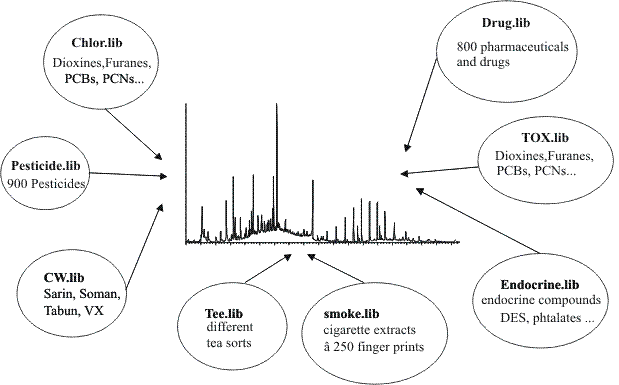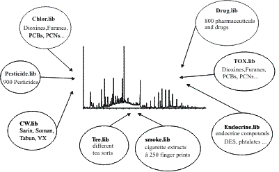 The concept of the AMDIS target libraries This ingenious topic is a milestone for scientists working with GC-MS or LC-MS. A stupid search for all substances existing in a certain chromatogram may be interesting but not truly clever. Always remember - CAS currently knows about 30 million substances (2002) - therefore a systematization is indispensable. Searching for a special group of substances (like PAHs, PCBs, alkanes, chloro-compounds, nitro-compounds) or a group of substances with a specific principle of action (carcinogenic, toxic, mutagene, endocrine) will lead to a comprehensive